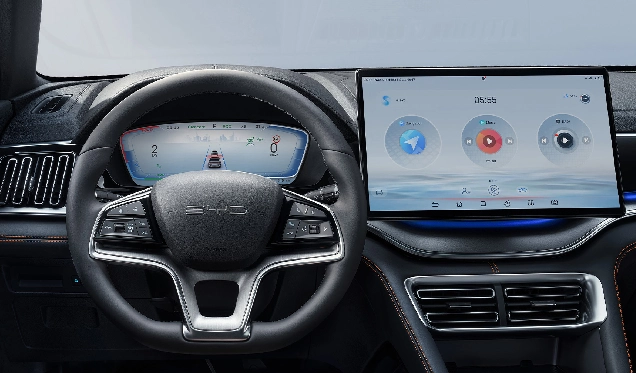 The BYD SEAL U DM-i features a large, rotatable touchscreen that acts as a central control hub for connectivity and infotainment.